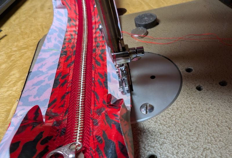 曲線部分は シワを押さえの下に押し込みながら、1針ずつ、確実に縫い進みます…結構無理ありますが…www